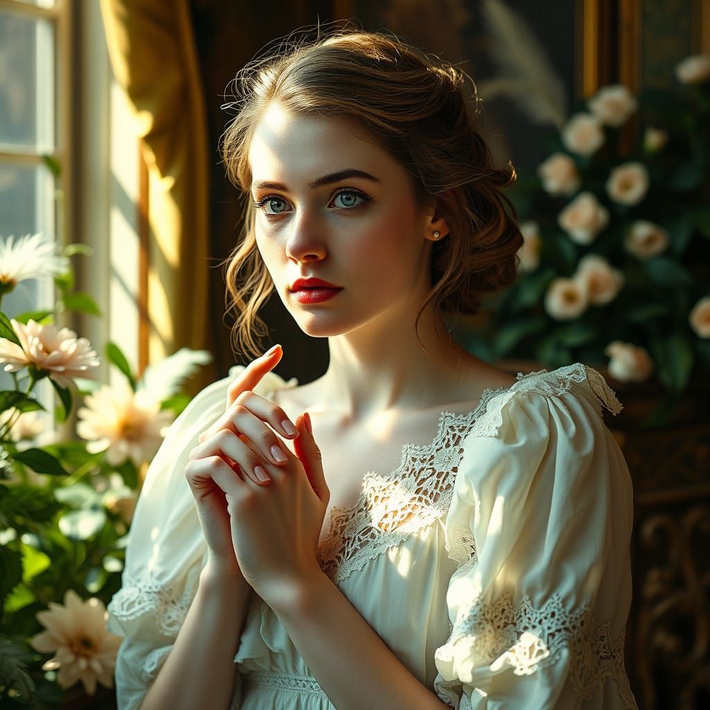 This enchanting portrait features a woman in a light summer dress, set amidst lush greenery and soft blooms, with warm golden light illuminating her expressive features and enigmatic gaze, evoking the dreamy romanticism of Pre-Raphaelite art with bold, vivid colors and cinematic lighting.
