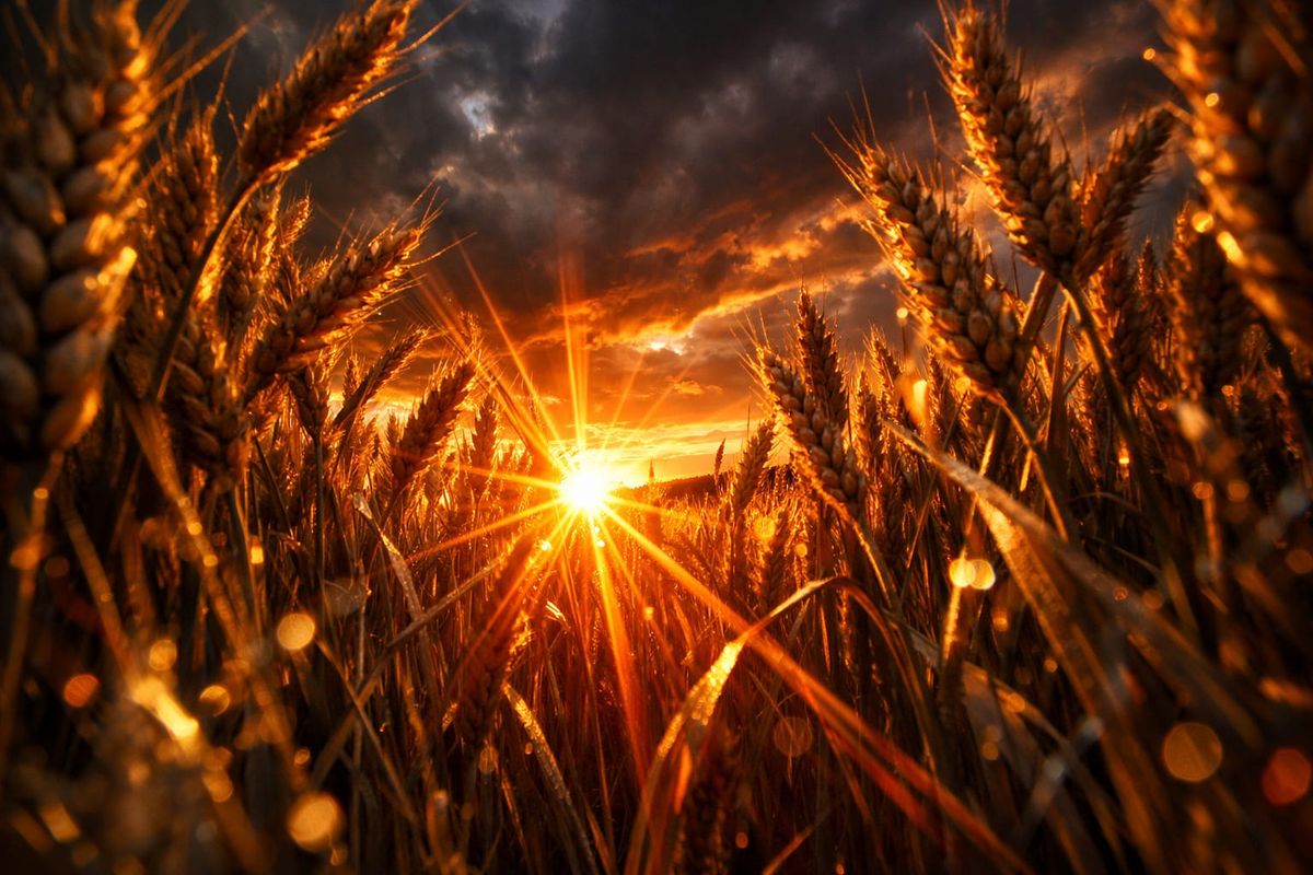 This image captures a dramatic sunset over an open field of wheat crops, featuring intense lighting and a deep depth of field for a maximalist, sinister aesthetic.