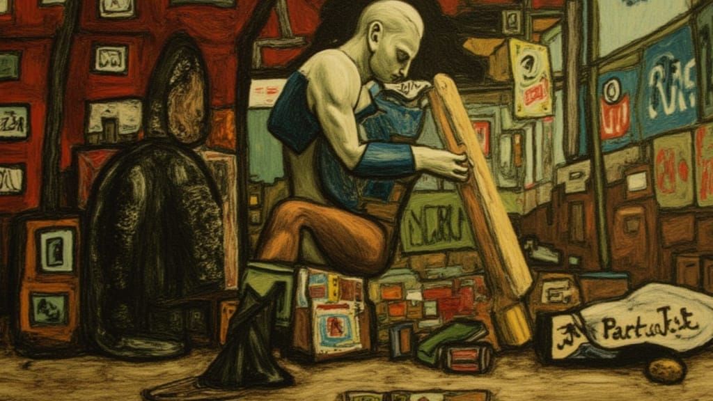 This image shows a dramatic street scene with sailors. The artwork employs a highly expressive style, capturing a sense of urban grit and tension with unique artistic flair. The scene evokes a vivid narrative.