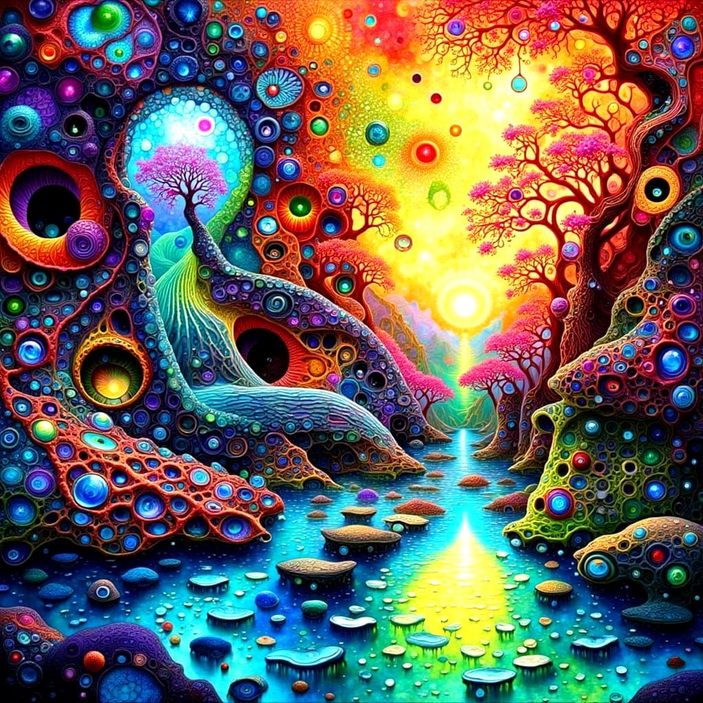 A vibrant image reminiscent of Hundertwasser's style, featuring strange architectural forms and amoeboid life in blues, greens, and pinks. This hyperdetailed digital illustration showcases complex patterns and glowing neon colors.