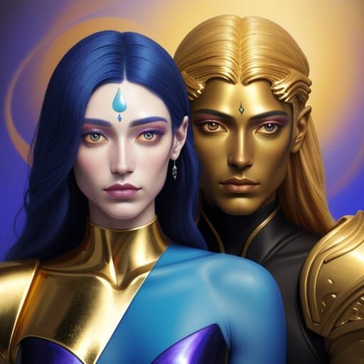 A striking picture of Phanes, a figure with a half-male, half-female body, in a vibrant oil painting style. The portrait features glowing skin, iridescent textures, and a mystical background.