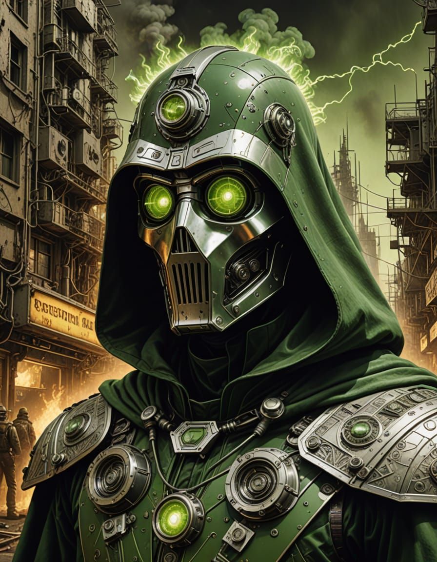 This image is a hyper-realistic, 8K resolution portrait of a steampunk Doctor Doom, set against a post-apocalyptic backdrop of nuclear explosions and mushroom clouds. The image features intricate, hyperdetailed technical schematics and maximalist synthwave-inspired aesthetics, blending steampunk and cybe...