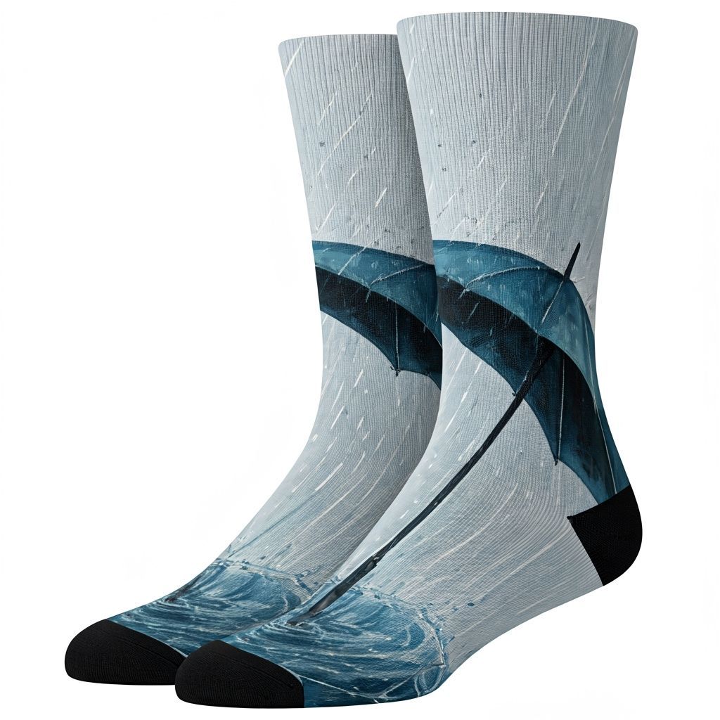 This image shows a pair of socks featuring a watercolor painting of an umbrella in the rain. The design is split across both socks against a raindrop-splattered gray background.