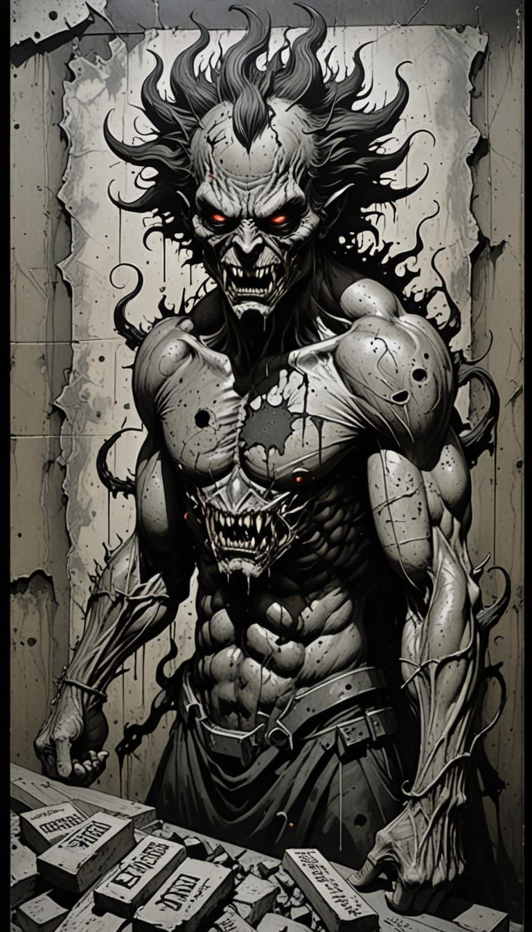 This image shows a dark and ominous graffiti piece with a focus on horror and the struggle within, created in a charcoal and concrete art style