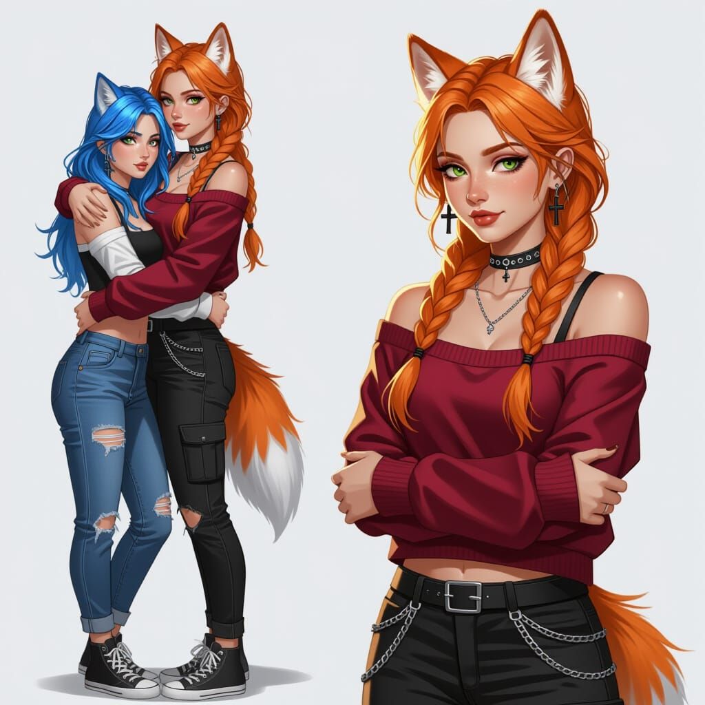 This image showcases two women with wolf features. The main subject has auburn hair and striking green eyes, dressed in casual attire. The scene features cinematic lighting and photorealism.