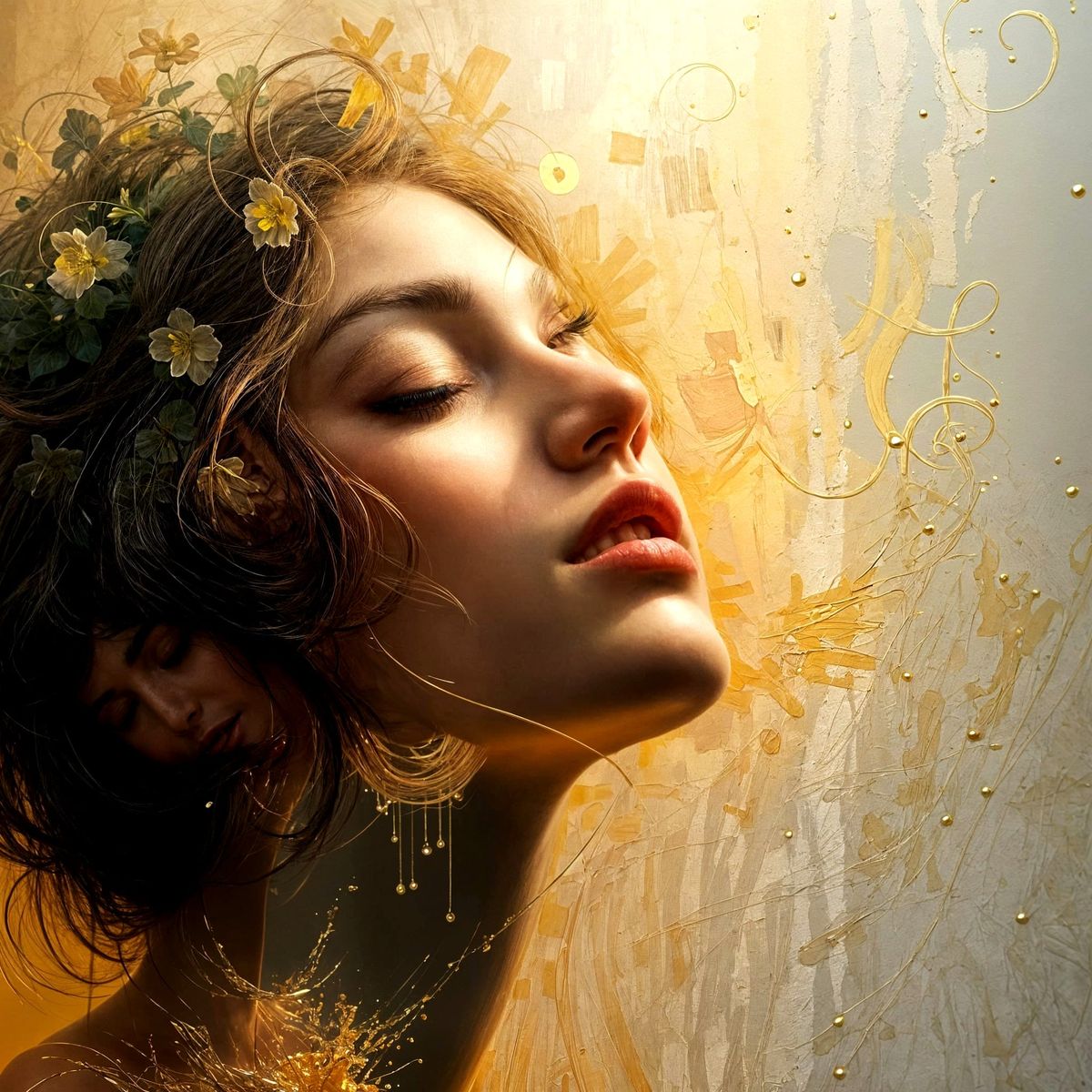 A woman with her eyes closed, her head tilted back, and her mouth slightly open. The lighting is warm and golden, creating a soft and ethereal glow around her. The woman's face is painted with delicate detail, highlighting her smooth skin and delicate features. The artist has used a loose and expressive brushstroke, giving the painting a sense of movement and energy. The background is abstract and textured, adding depth and dimension to the composition. The overall effect is one of tranquility and beauty, capturing a moment of peace and serenity. Andh73