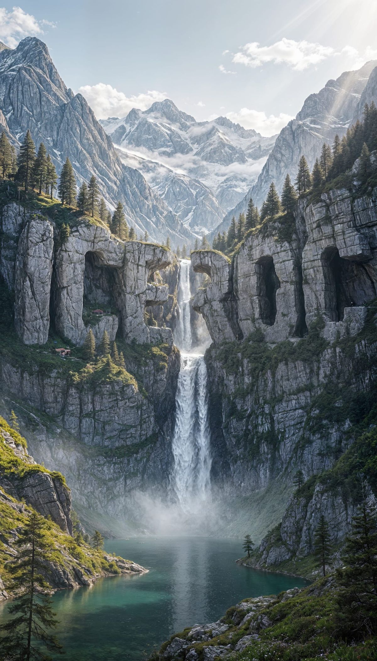A hyperrealistic cinematic landscape inside the Triglav National Park, Slovenia: massive stone letters spelling "ICEROC" are carved into a mountainside, blending seamlessly into the rocky terrain. The letters appear ancient and eroded, overgrown with moss and alpine vegetation. From the center of the ...