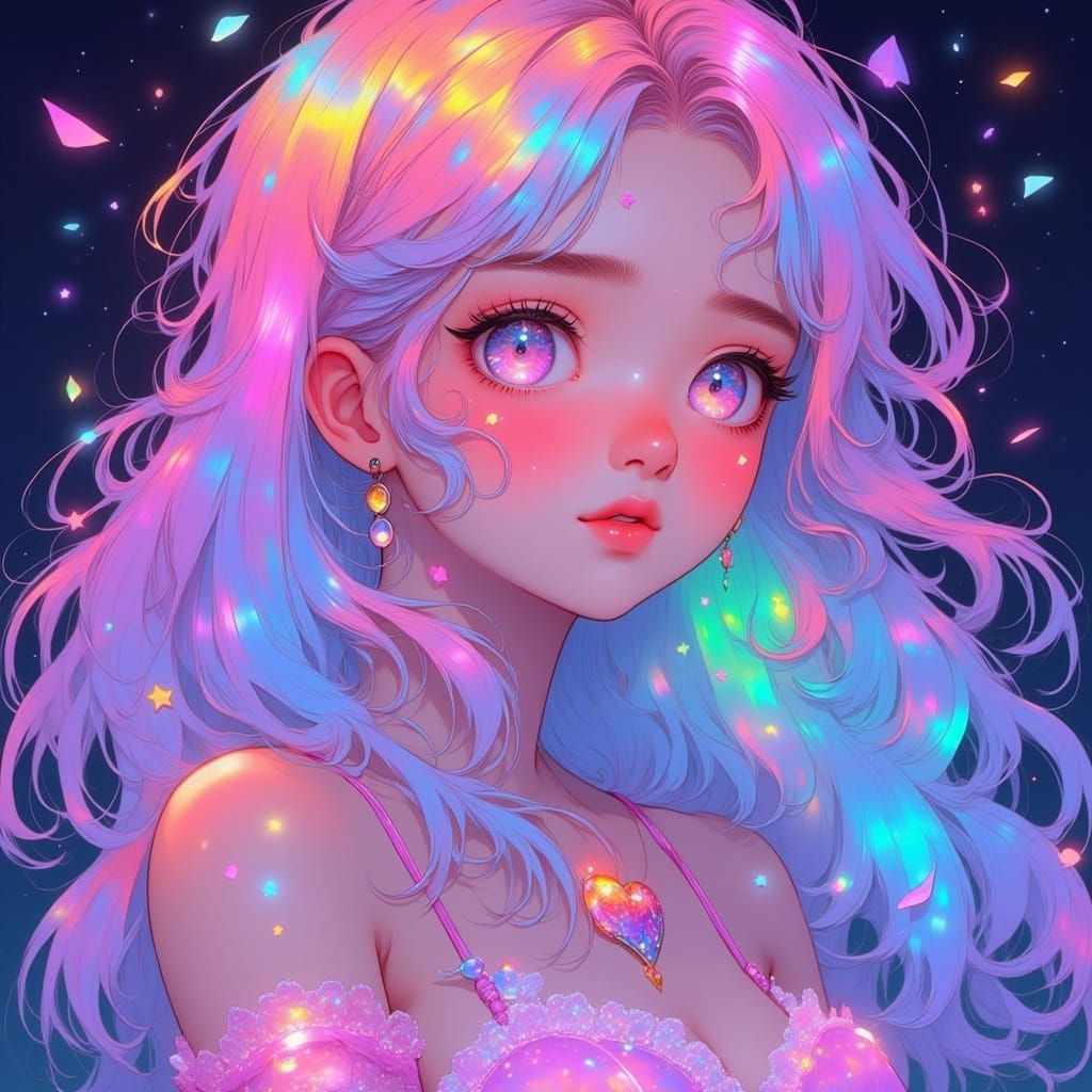 Easily generate unique anime girls with rainbow hair and glowing hearts using our free AI image generator.