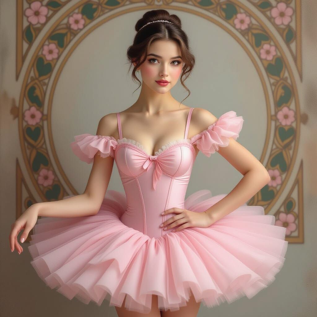 A realistic image of a young ballerina in a pink tutu striking an elegant pose. The artwork evokes the realism of classical art, with intricate detail and soft lighting.