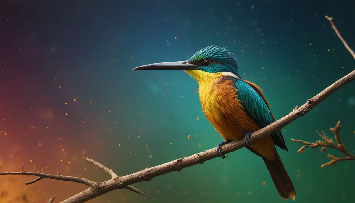 This hyperrealistic concept art features a vividly colored yellow-billed jacamar perched on a branch, illuminated by dramatic side lighting. The image boasts intricate detail and explosions of color.