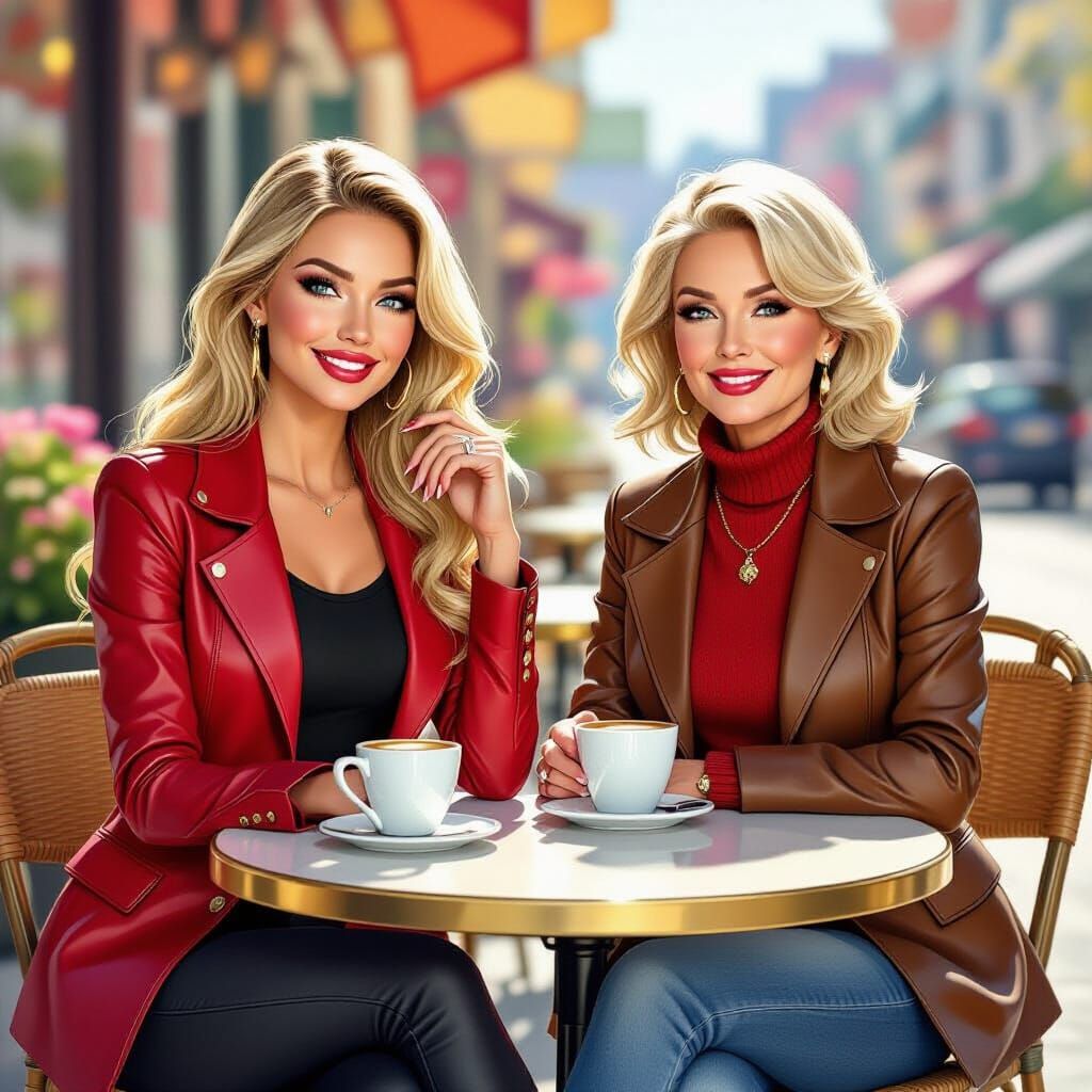 A vibrant comic art illustration of a young pinup model and her elegant mother sharing a meal at a sunny outdoor cafe, featuring detailed faces and warm smiles.