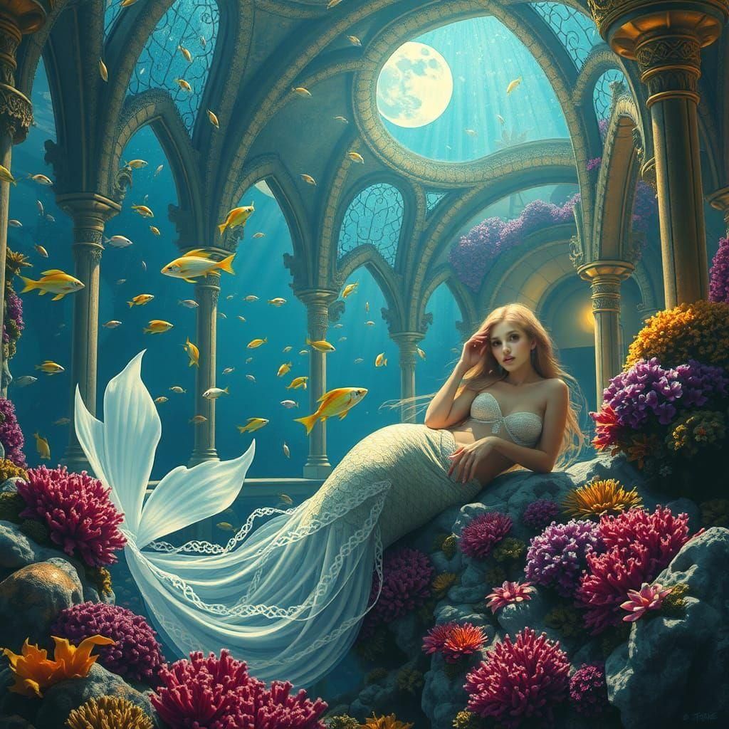 A striking picture of a mermaid in an underwater palace surrounded by a vibrant coral reef and colorful fish. The scene is rendered with ultra-fine brushstrokes and deep textures, creating a cinematic and detailed image.