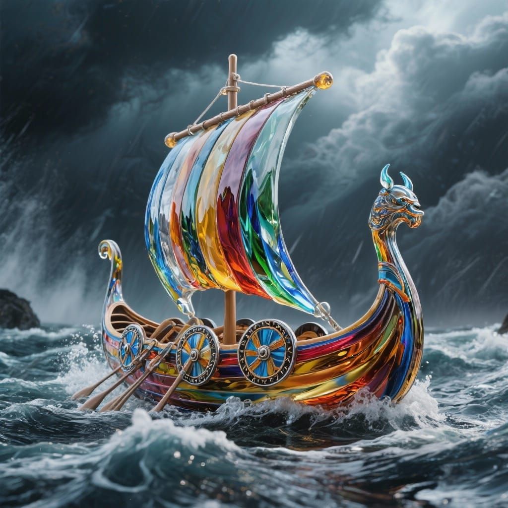 This image features a vibrant glass sculpture depicting a Viking longboat navigating a tumultuous, stormy sea, showcasing intricate details and dynamic movement.
