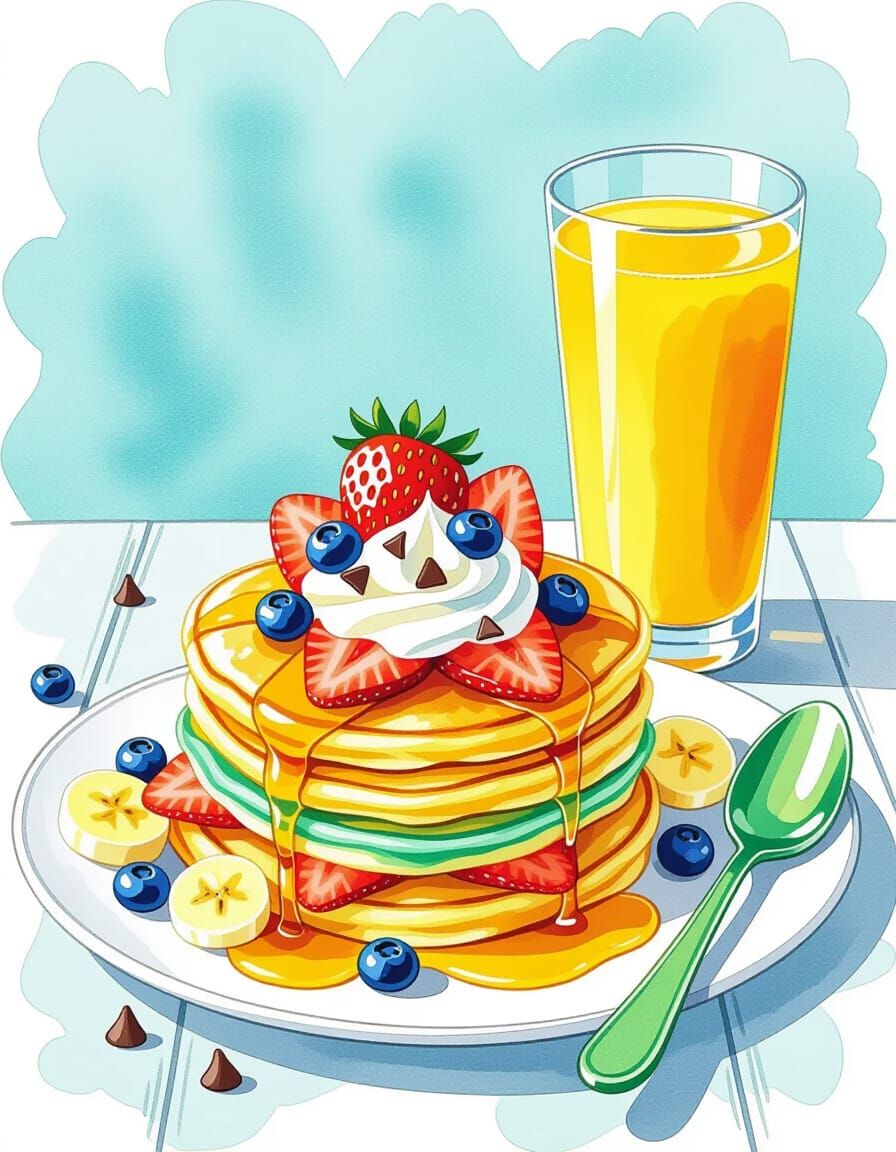 This image shows vibrant rainbow star pancakes with fresh fruit, chocolate chips, whipped cream, and honey, next to orange juice. Rendered in a whimsical watercolor style.