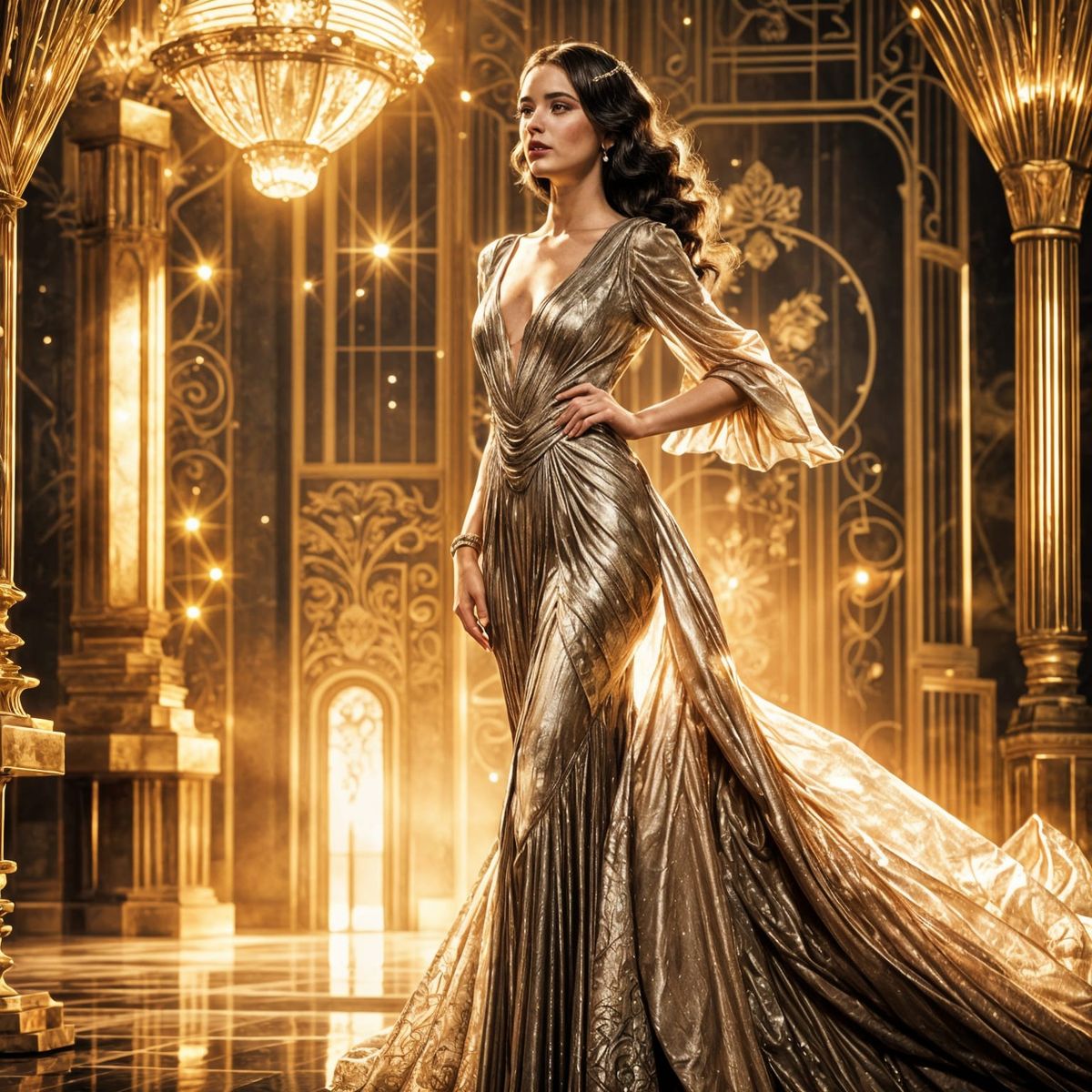 This image features an ethereal, divine lady with long dark hair, presented in a realistic, cinematic, and retro art deco style.
