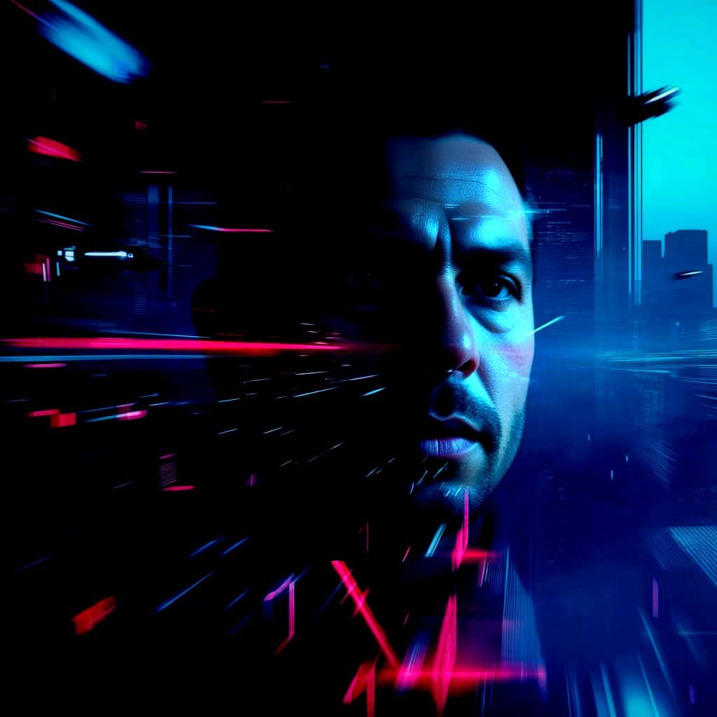 This image features a close-up of a woman's face blending into a futuristic cyberpunk city with a misty, neon-grey tint. Glitchcore effects and chromatic aberration add to the atmospheric, hyperdetailed scene.