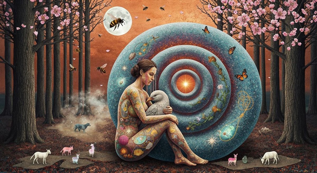 This image depicts a 1970s female sculptor within her massive spiral artwork, rendered in a surreal bio-art collage style with botanical and energy line elements. It symbolizes transformation and self-discovery.