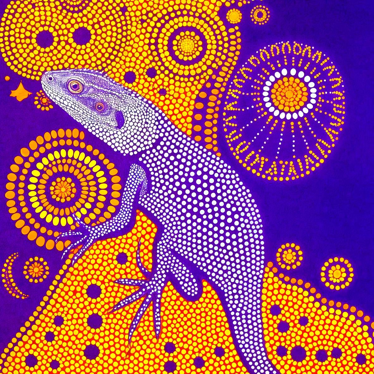 Easily combine two images with our free AI image generator and create stunning double exposure art, like a lizard and Aboriginal dot painting.