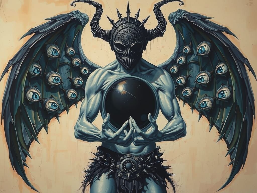 This image portrays a full-bodied humanoid deity with a mask and wings, summoning a dark sphere. The surreal artwork features a gothic and psychedelic style, with cosmic horror elements and dramatic flair.