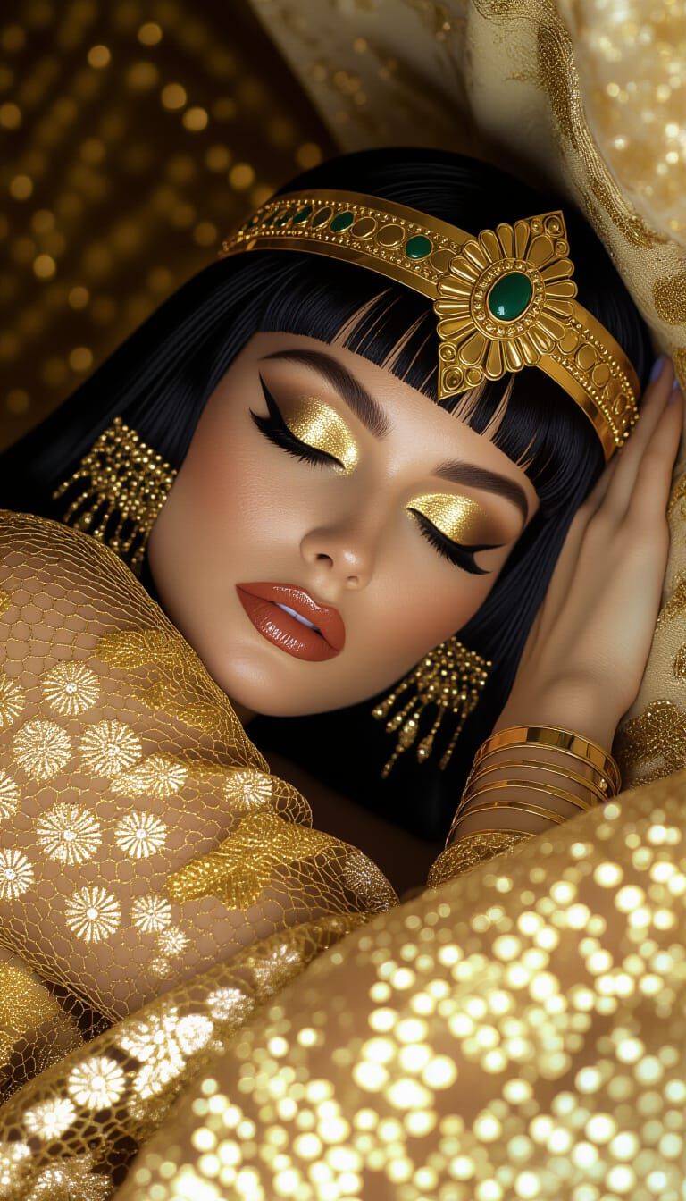 A striking close-up portrait of Queen Cleopatra in repose within her tomb. Photographed with studio lighting and sharp focus, resembling professional portrait photography.