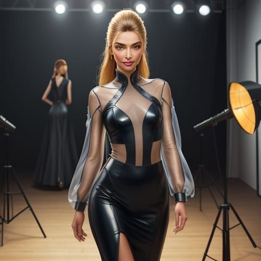 This digital matte painting shows a beautiful Ukrainian woman in a studio, wearing tight transparent leather. Soft golden hour lighting enhances the photorealistic detail.
