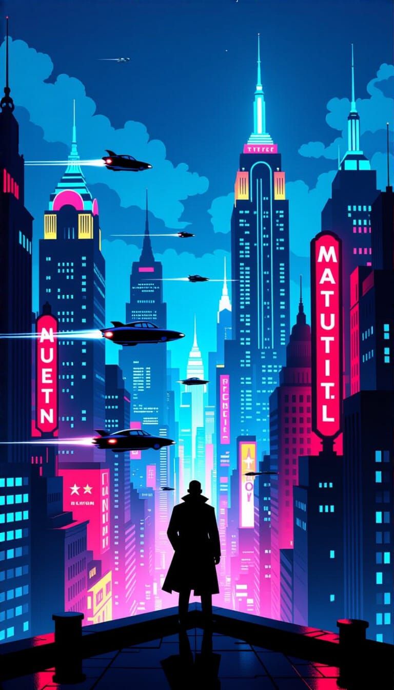 A vibrant, retro-futuristic cityscape at night, with flying cars zipping between towering art deco skyscrapers adorned with neon signs. A lone figure in a trench coat stands on a rooftop, silhouetted against the glowing metropolis. The style is a blend of classic noir cinematography and a vibrant, almost comic-book-like digital painting, with dramatic shadows and saturated colors.