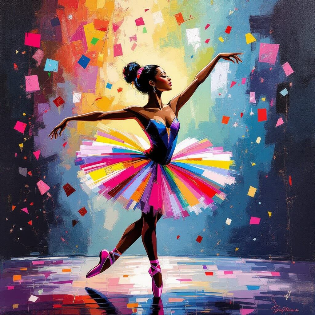 This image shows a black ballerina dancing on a confetti-strewn stage. The artwork features bright, bold lines and geometric forms in a vibrant pop art style.