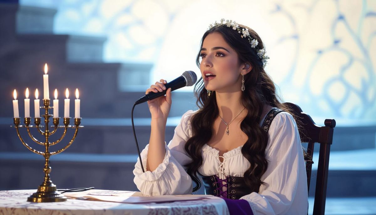 This image shows a young woman singing, illuminated by a spotlight. She wears traditional Hebrew clothing, including a dark leather corset with embroidery. The artwork evokes the style of Art Nouveau with a mystical atmosphere.