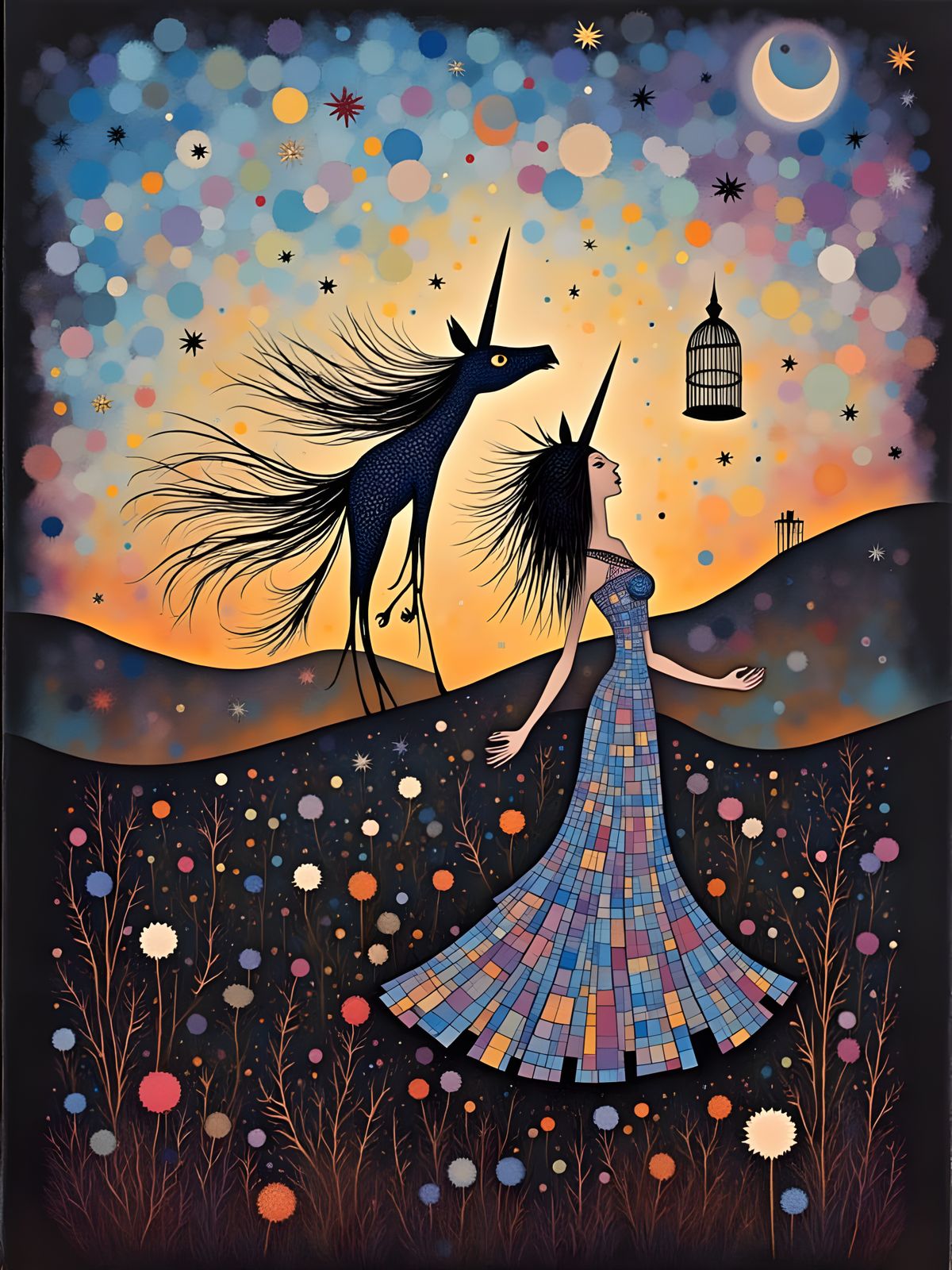 <lora:Mythoglyphic:1.0> <lora:The Magic Loch flux:1.0> Abstract woman with unicorn horn. Dancing in a hill. Portrait. Pastels. Scratch art. Memories of happiness within the gloom. Whispy. People and blue with sunset colours. Plaid. Birdcage. Fossils. Pastel on black.