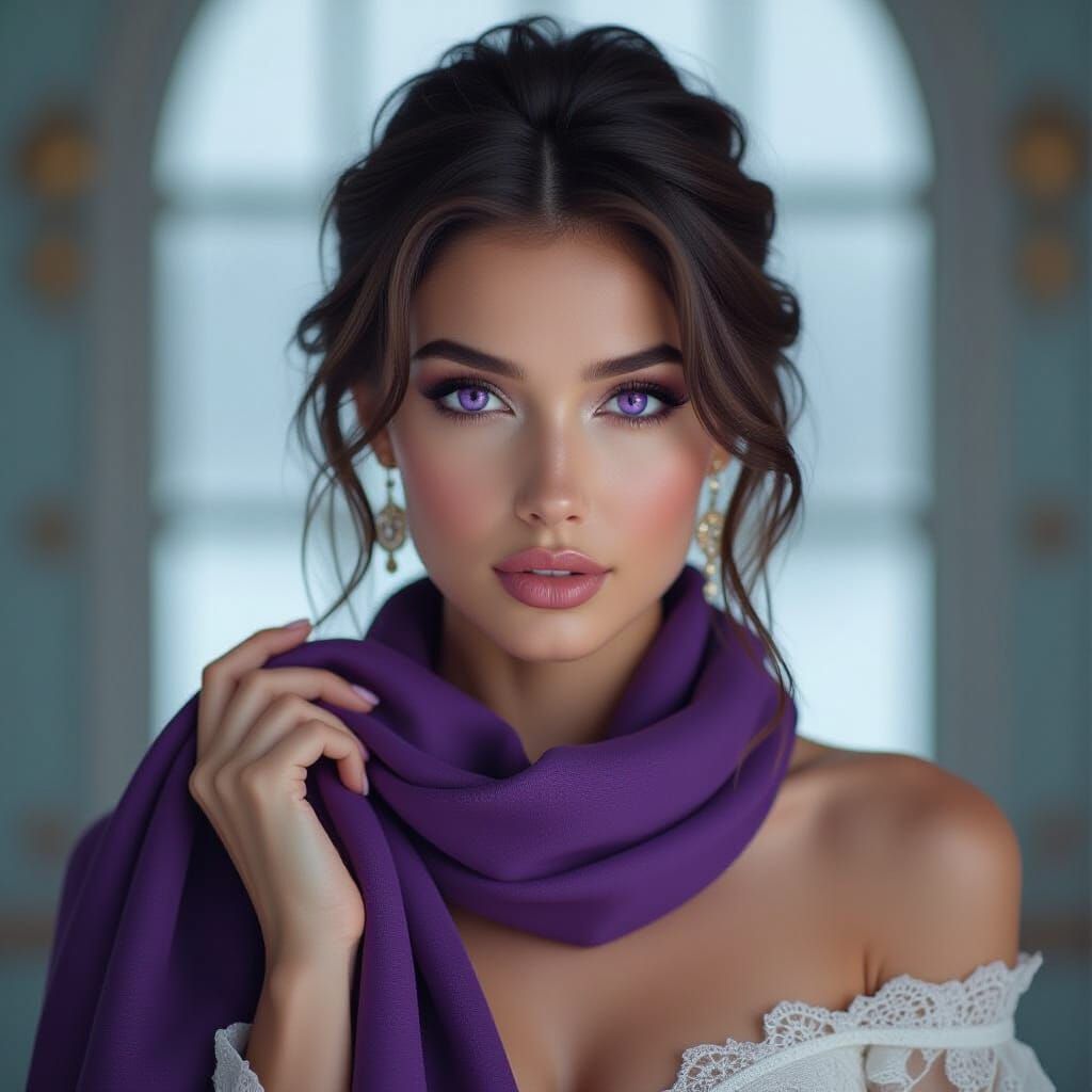 A hyperrealistic image of a woman with striking purple eyes and partial makeup, holding a purple scarf. The image is richly detailed with high contrast and atmospheric tones.