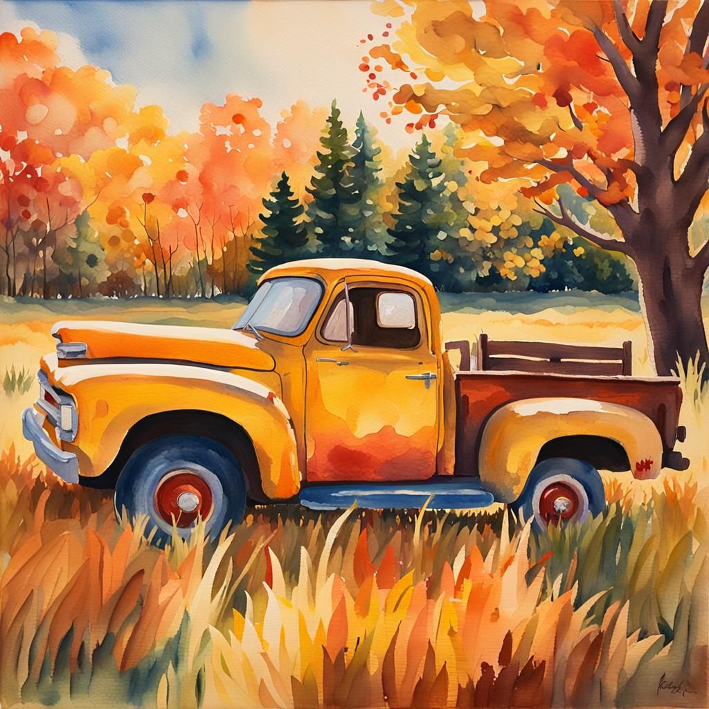 A striking picture of an oversized apple filling the truck bed of a vintage pickup in a sun-drenched fall meadow. The image is reminiscent of Beatrix Potter's watercolors.