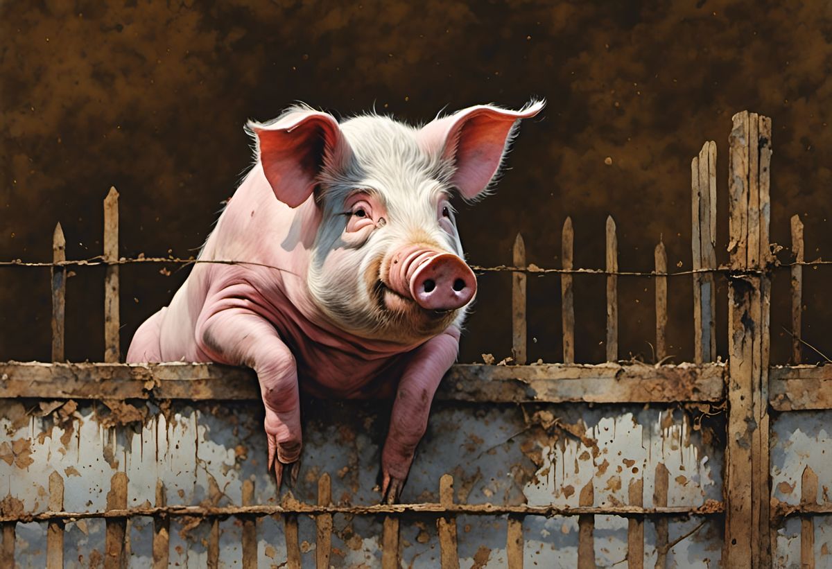 A watercolor painting of a pig standing on its hind legs, peering over a fence. The image is highly detailed, with a nostalgic and atmospheric feel, rendered as digital matte painting.