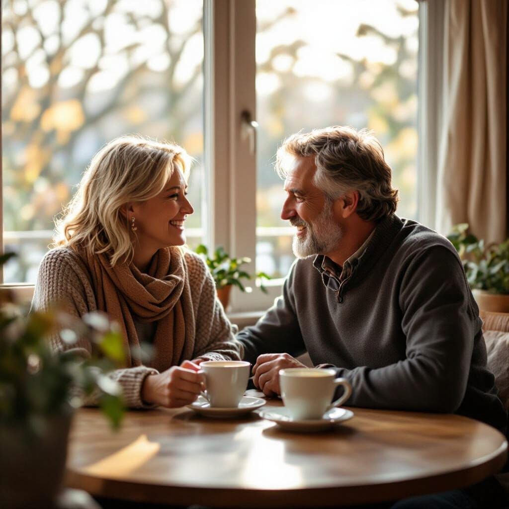 This image shows a couple married for over 30 years sharing coffee. The picture depicts the couple playfully in love as they enjoy a peaceful morning together.