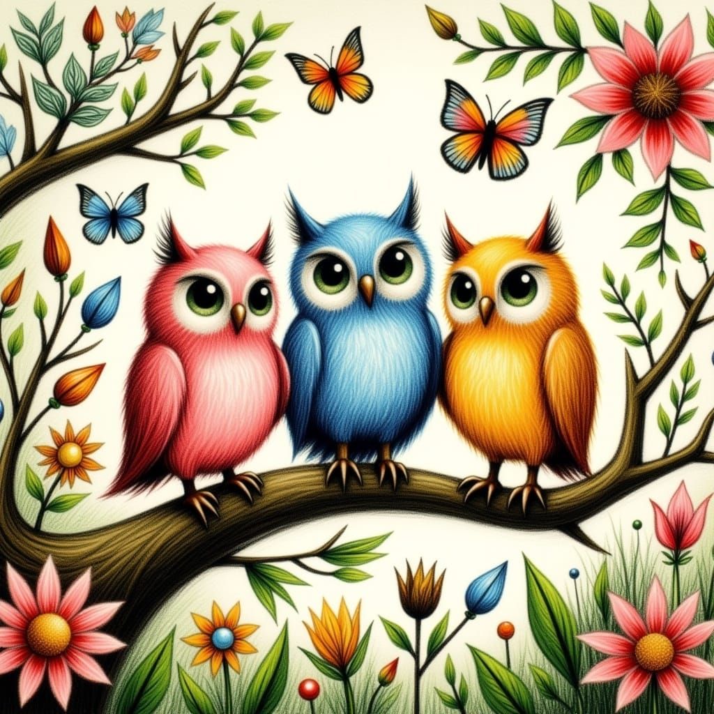 A charming image presents three fluffy, pastel-colored owls perched on a branch amidst vibrant foliage. Rendered in a whimsical style, the illustration captures intricate textures and a dreamy, storybook-like quality.