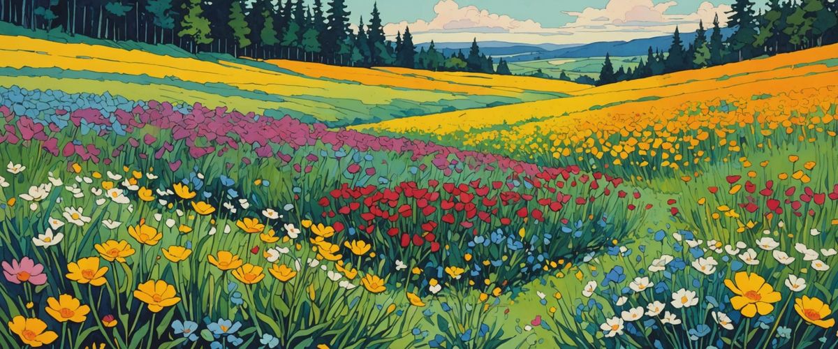 Generate unique field of flowers images in retro comic style. Free and easy AI art creation.