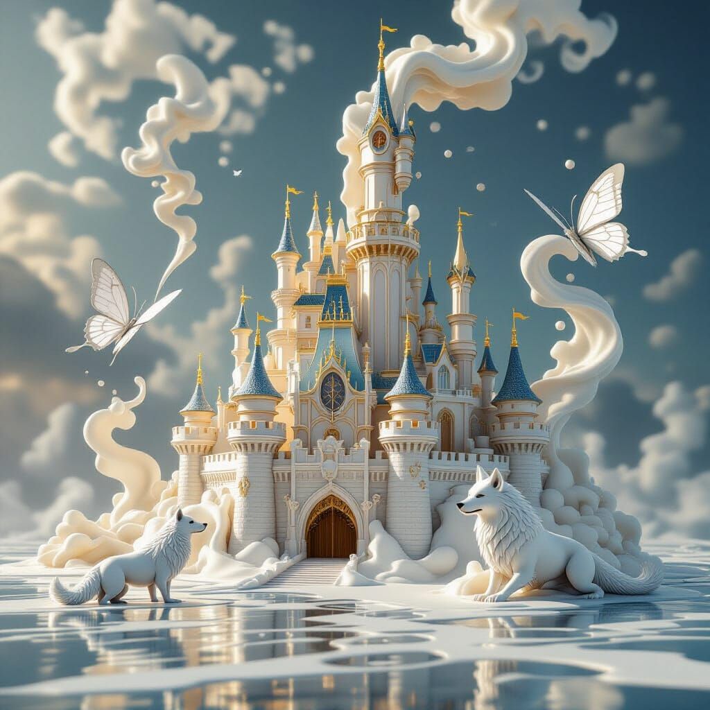 This image showcases a coffee house with abstract steam, a castle made of milk, and a dragon, wolf, and butterfly formed from water. Features hyperrealistic, ethereal 3D shading.
