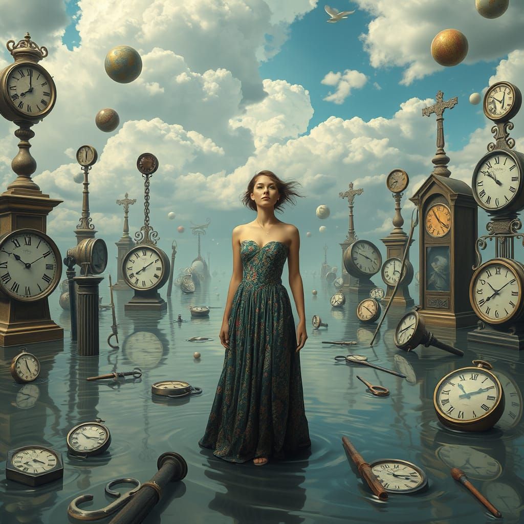 A surreal image of a woman amidst clocks and tools in a flooded, dreamlike setting. The artwork uses vibrant colors and distorted shapes in a hyper surrealist style.