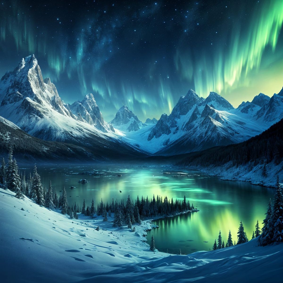 This image shows a majestic polar light sky above a snowy winter landscape with mountains. The digital matte painting has a dramatic, atmospheric, and intricately detailed aesthetic.