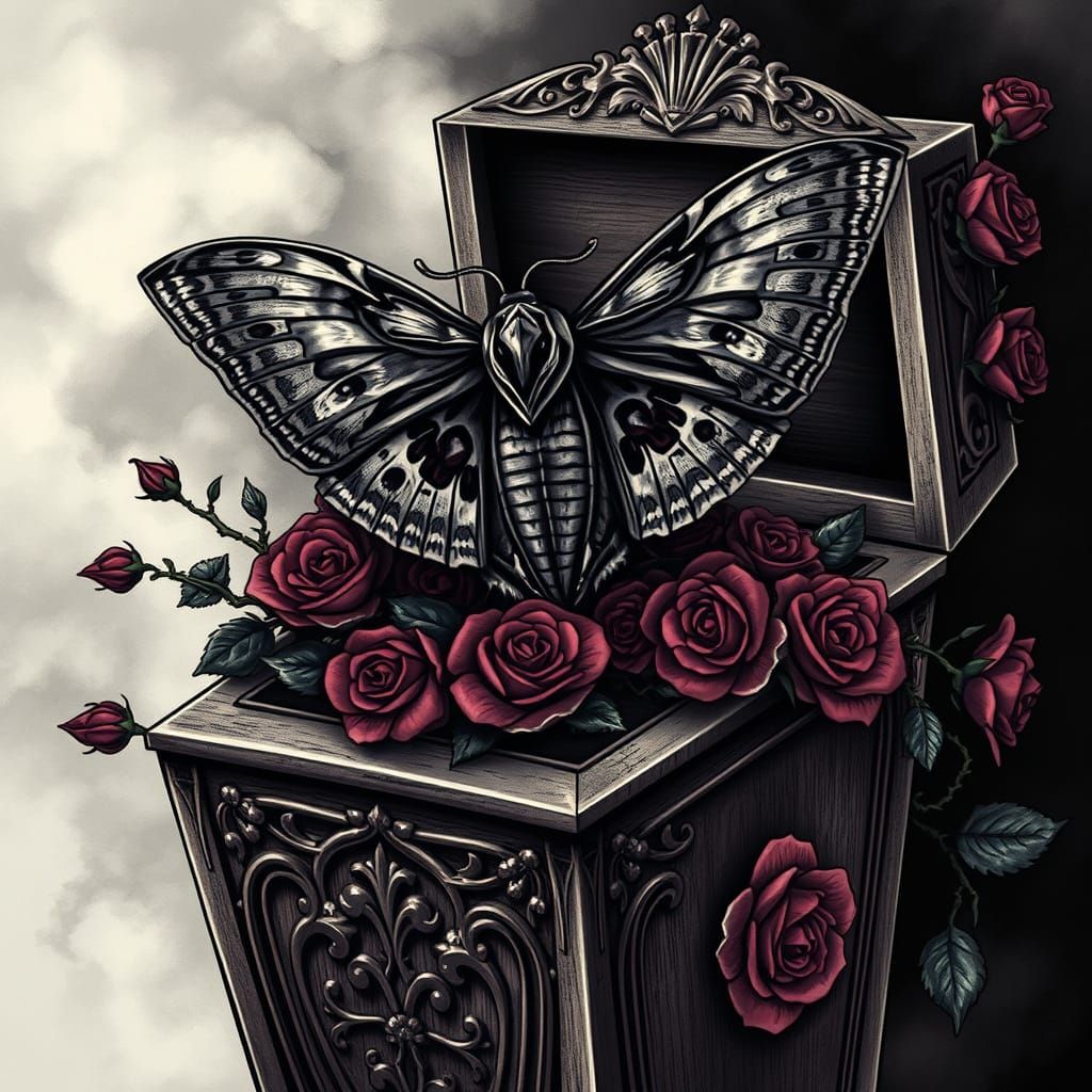 This image features a Victorian gothic coffin in a neo-traditional tattoo style, adorned with intricate carvings and aged wood texture. Dark roses and vines frame the scene, with a death's-head hawk moth on the lid. Moody shadows and gothic colors create an eerie atmosphere.