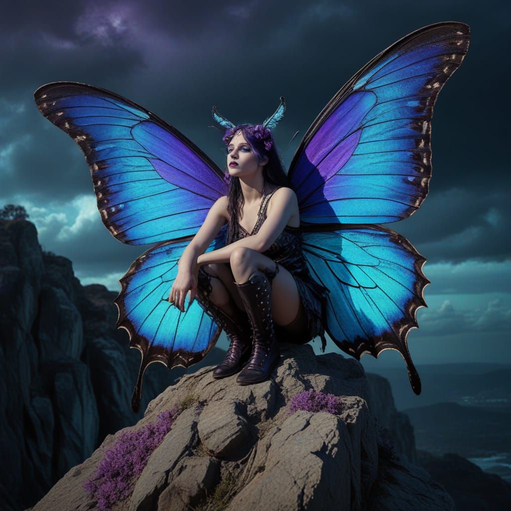 A striking picture of a dark butterfly guardian on a cliff, rendered in a naive art style. Iridescent wings shimmer in the dramatic lighting, with a moody color scheme of purple and blue.