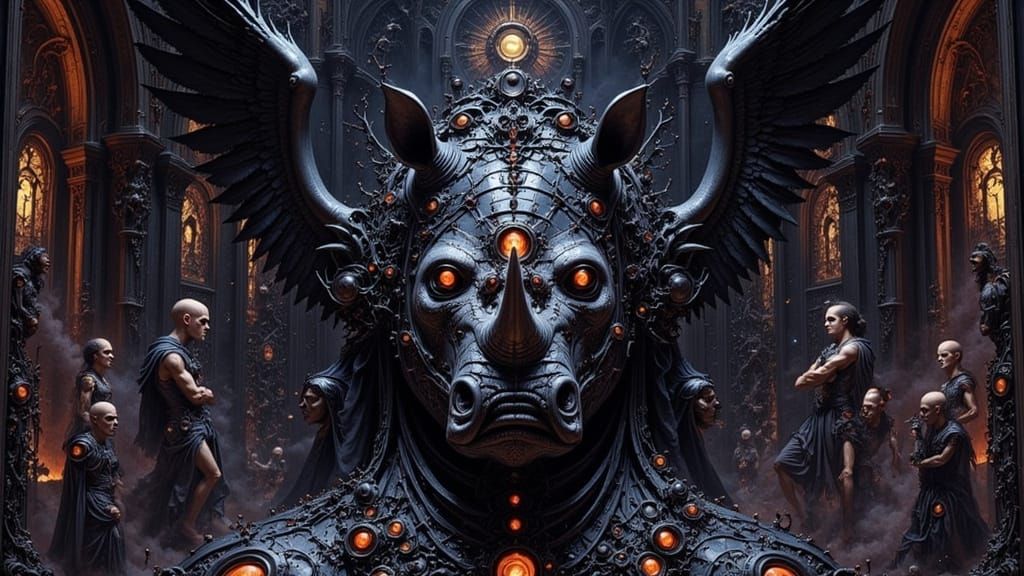 This image shows a majestic electric rhino with glowing eyes, lighting up the ornate rooms and unsettling residents of a haunted castle. Concept art with dynamic, volumetric lighting.