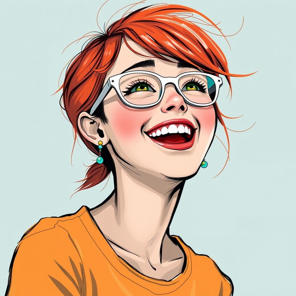 This image shows a full-length portrait of a laughing girl with green eyes and red hair. She wears glasses and colorful earrings in a vibrant, expressive art style.