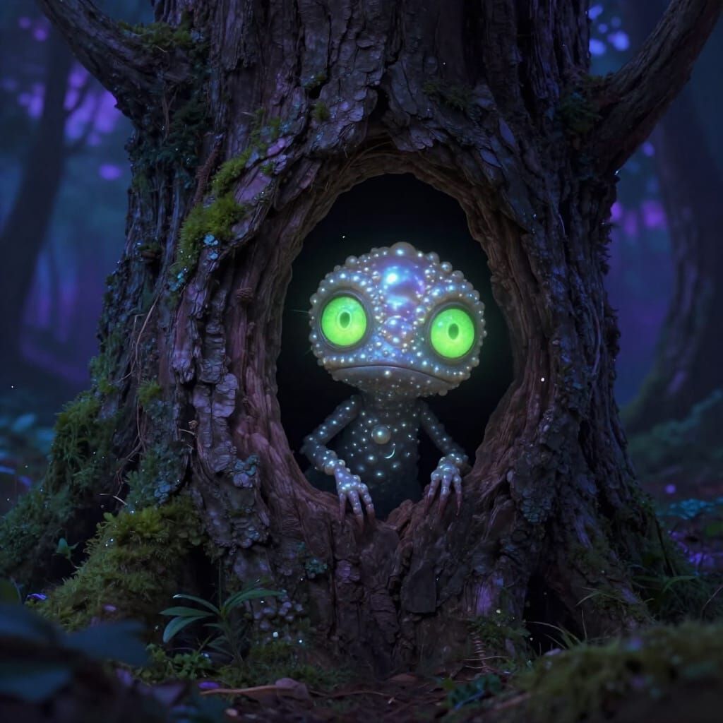 This image captures a mystical creature with glowing, pearl-like neon green eyes emerging from a tree trunk hole. The scene evokes ethereal forest magic with soft, ambient lighting and a bioluminescent glow, rendered in deep blues and purples.