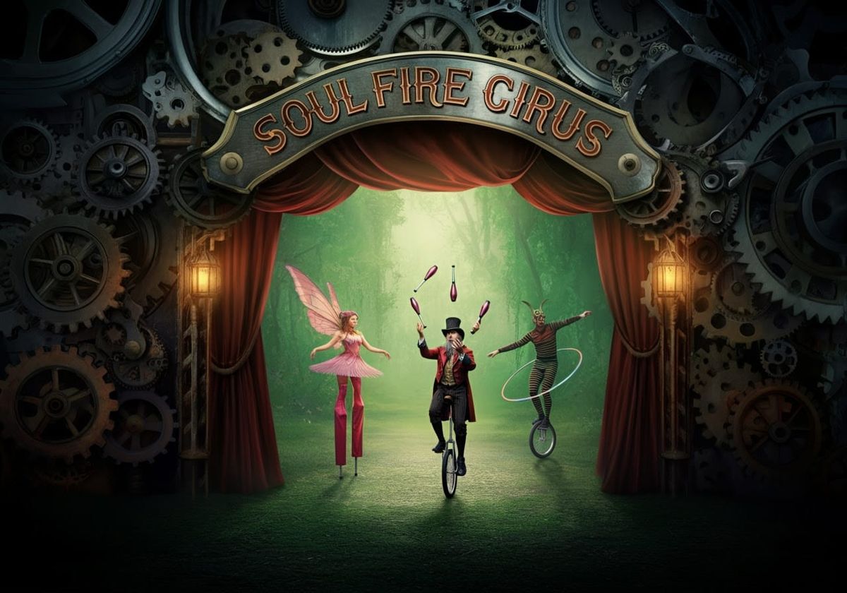 This image shows a fantastical, 8k matte painting of a cyberpunk circus tent entrance with a mechanical, industrial aesthetic, revealing a lush, vibrant green forest inside, complete with fantastical characters and detailed scenery.