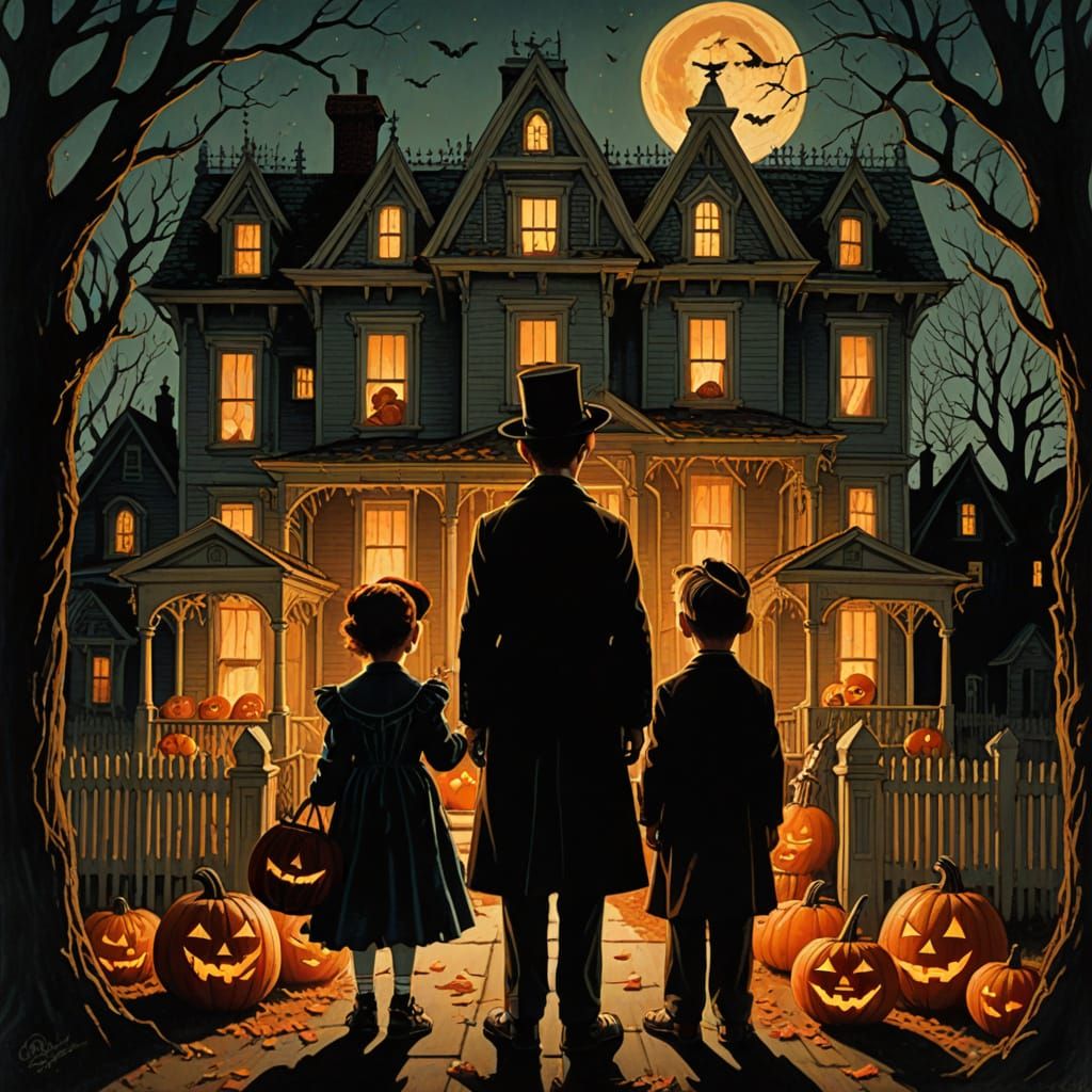 A wholesome yet unsettling illustration of children in vintage costumes trick-or-treating at a haunted Victorian house on Halloween night, featuring detailed brushwork and nostalgic colors with mysterious shadows.