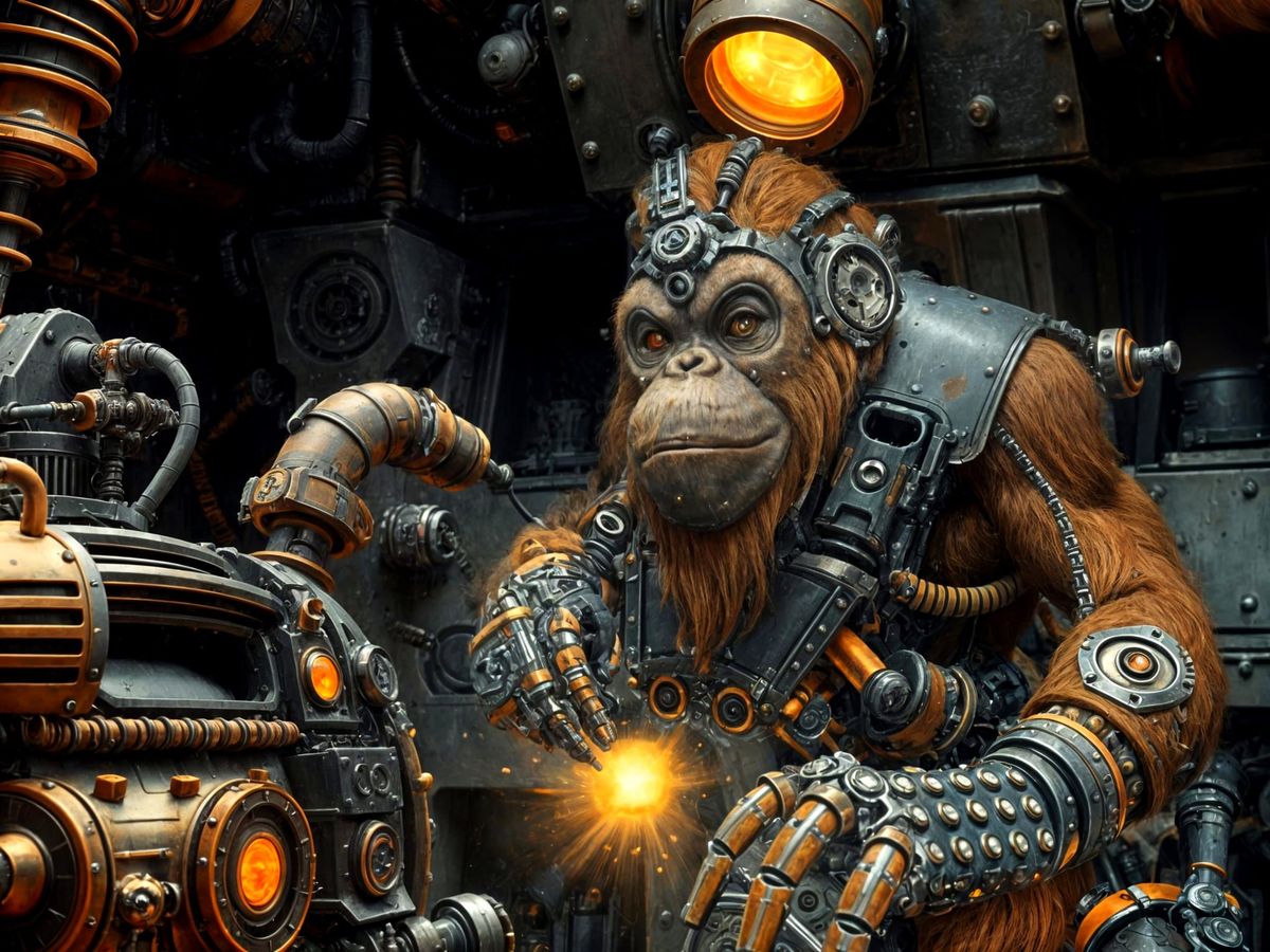 This image shows a steampunk cyborg orangutan happily repairing an engine inside a gothic Warhammer 40k spaceship engine room. The orangutan has a partially cybernetic body.