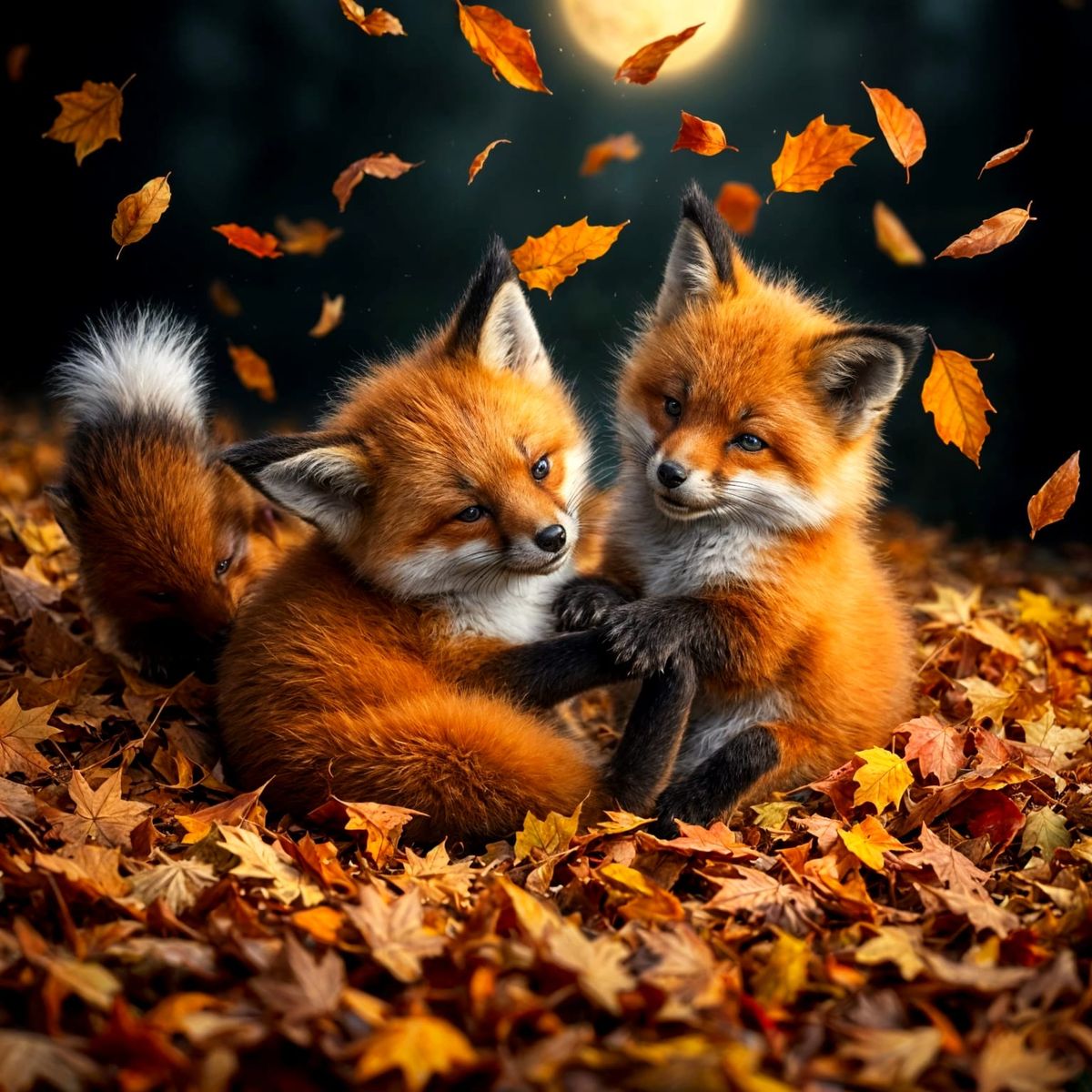 This image shows two fox cubs playing in a pile of leaves under the moonlight. The scene is filled with energy and movement, captured with photorealistic detail and a colorful backdrop.