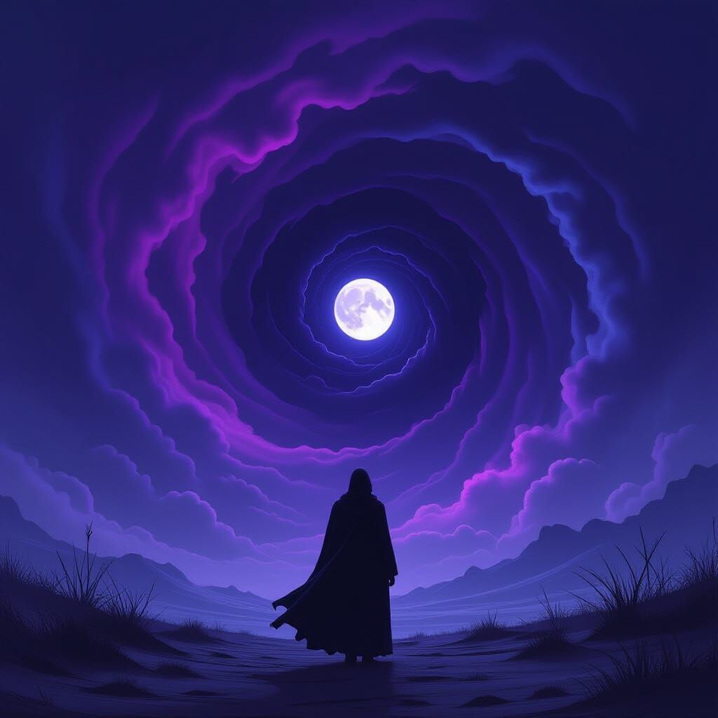 This image showcases a lone figure illuminated by moonlight, standing strong against a dark, swirling vortex. It's depicted in a digital matte painting style with dramatic lighting, emphasizing hope and resilience.