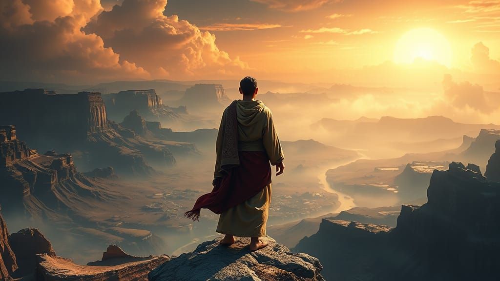 This image depicts a mystical scene of Abraham standing at the edge of a vast, detailed landscape, surrounded by an ethereal aura, reminiscent of fantasy concept art with a blend of photorealism and fantastical elements, evoking a sense of wonder and reverence.