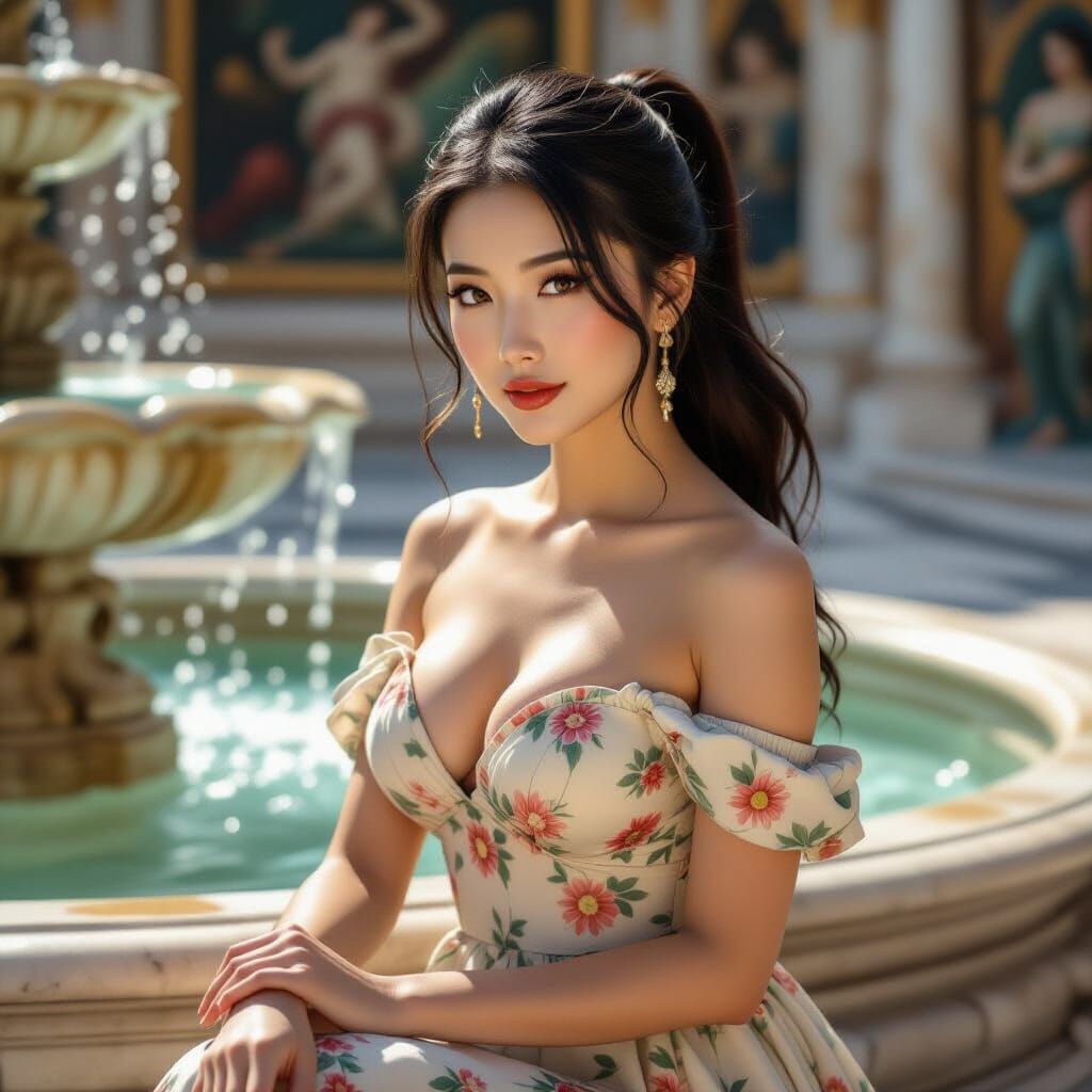 This image features a beautiful Asian woman in a sundress near a fountain, rendered with dramatic chiaroscuro lighting and rich, naturalistic colors. Evokes classical beauty and divine artistry.
